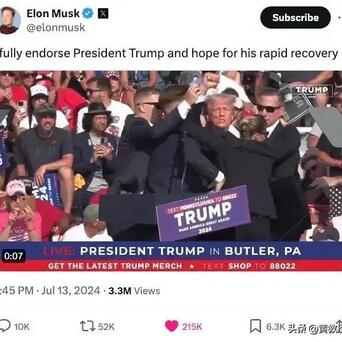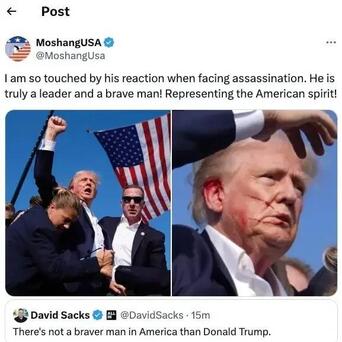 刺杀特朗普枪手已被确定为“反法西斯主义组织”成员马克·维奥莱茨 (Mark Violets)。特朗普被刺杀后。高举双手,坚定勇敢,这个反应,足够让犹豫不决的人下定决心了!硅谷精英创业人亿万富翁David Sacks发推文,川普是美国最为勇敢的人。川普遇刺后仅十多分钟,Musk果断通过X宣布,正式全力背书川普。 看这个架势,特朗普稳赢了。储殷之前还在预判,拜登会赢[捂脸][捂脸]